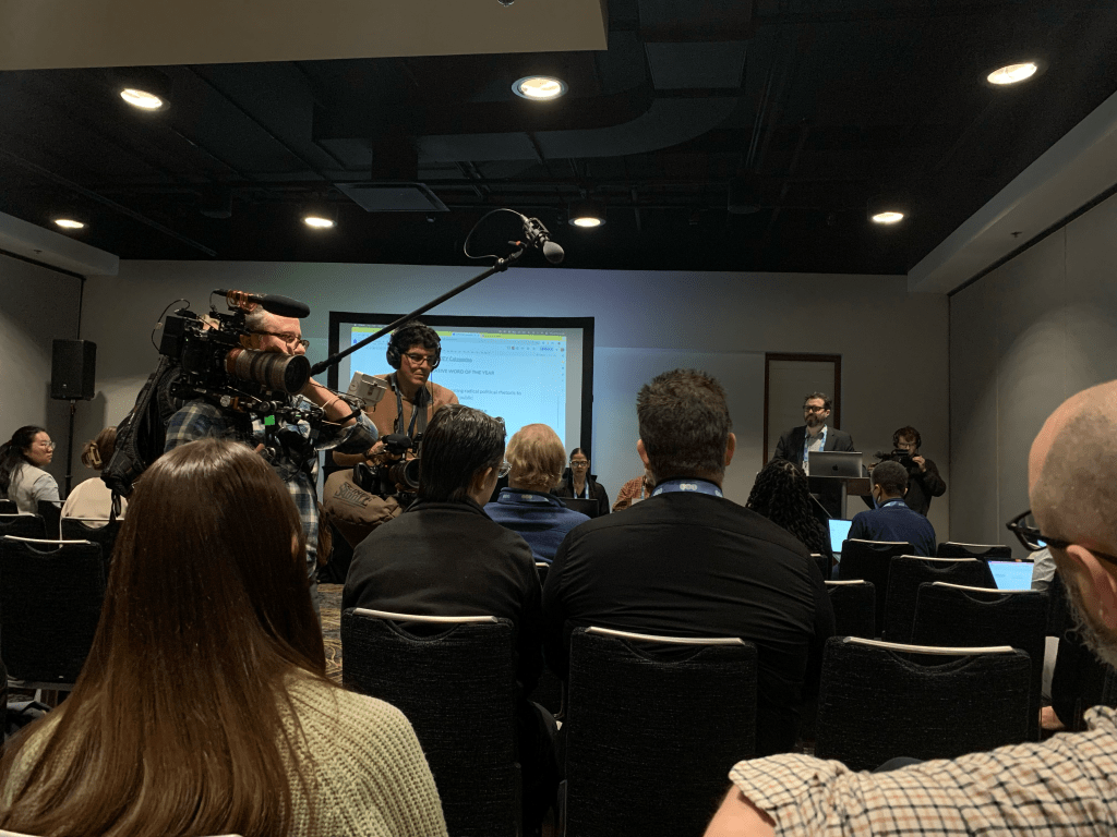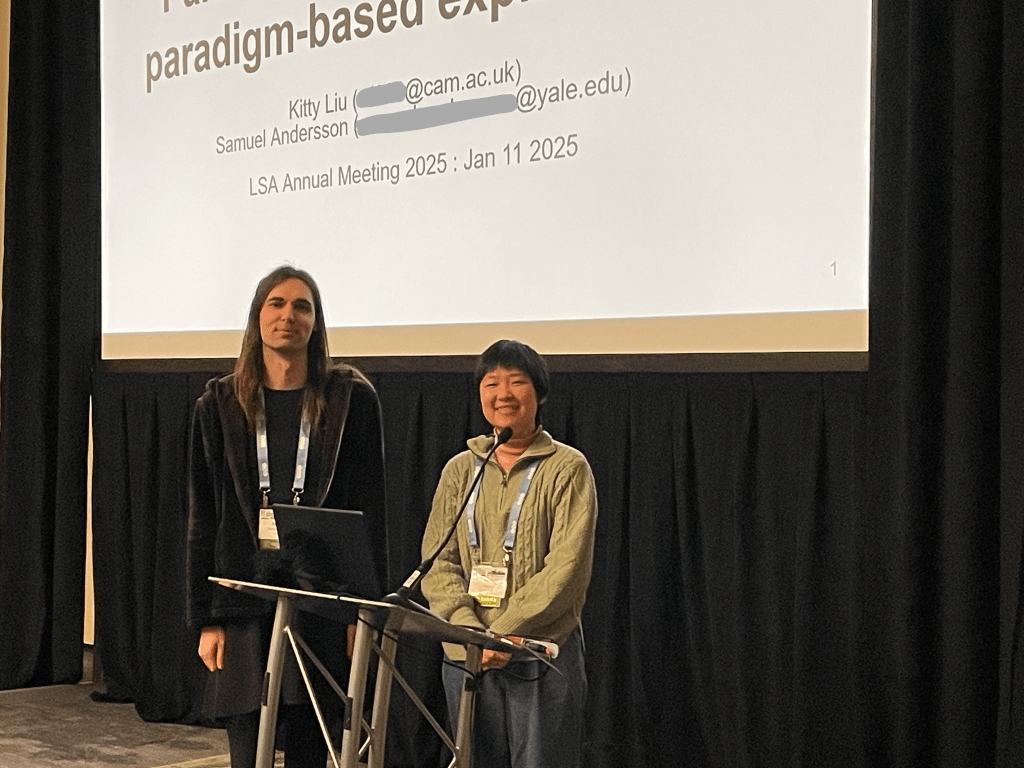 The material for our presentation came from my research for my MPhil thesis, which I completed at the University of Cambridge in 2024, supported by one of PhilSoc’s Masters bursaries. Samuel had contributed to some of the analyses in my MPhil through many inspiring conversations about morphological paradigms, as well as their superior grasp of Python, so we decided to give a joint presentation on those findings to acknowledge their collaborative nature. On top of giving our presentation and receiving feedback, I also greatly enjoyed attending a wide range of event at the LSA, including Chris Geissler’s presentation on the consonant classification system described by medieval Tibetan grammarians, and LSA President Marlyse Baptista’s plenary on a postcolonial and non-exceptionalist reconceptualisation of creole languages. I also got to attend the American Dialect Society’s Word of the Year selection process, which is held at the LSA each year. Nominations for 2024’s Word of the Year included brat (after Charli XCX’s 2024 album), sanewashing (presenting extreme political rhetoric as reasonable), yap (to chatter), and the overall winner rawdog (to undertake an action without customary protection) (Zimmer, 2025).